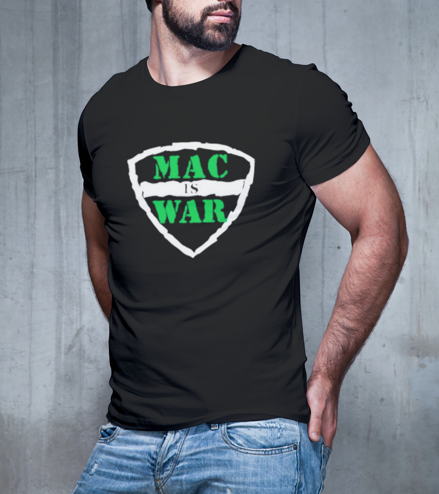 MAC IS WAR T-shirt — on-model front view, hands near pockets.