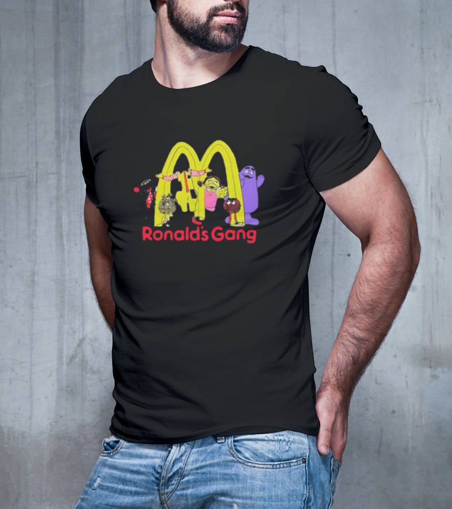 Ronald's Gang Mc Characters Under Golden Arches T-shirt — on-model front view, hands behind back.