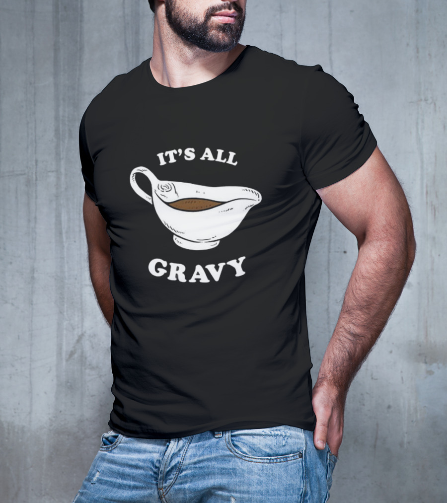 Thanksgiving It’s All Gravy T-shirt — on-model front view, hands behind back.