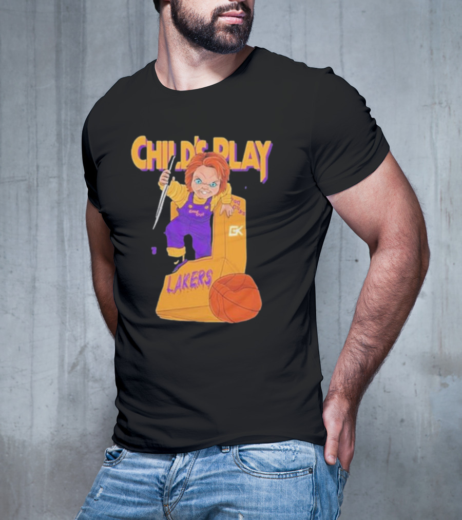 Child's Play Los Angeles Lakers Chucky Basketball Box T-shirt — on-model front view, hands behind back.