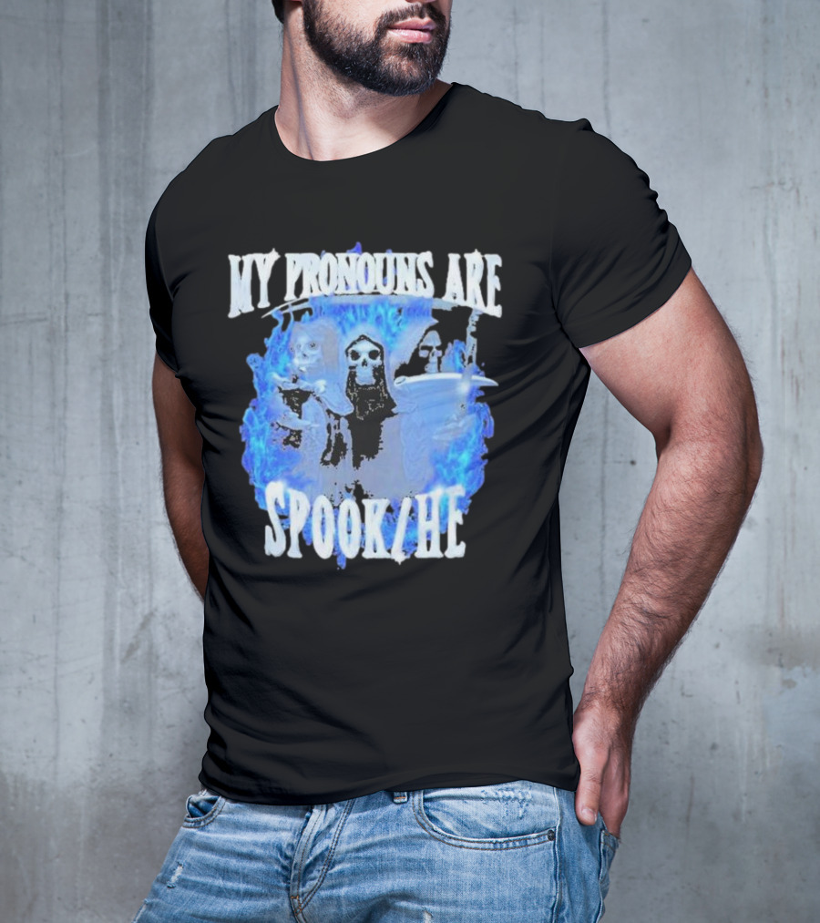 My Pronouns Are Spook He Blue Flames Grim Reaper Trio T-Shirt