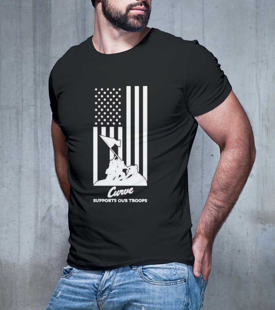 Curve Supports Our Troops Flag Raising T-shirt — on-model front view, hands near pockets.