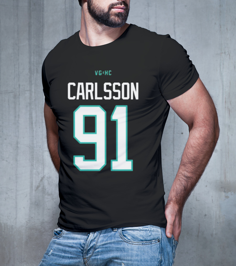 VG HC Carlsson 91 Anaheim Ducks Ww 3rd T-shirt — on-model front view, hands near pockets.
