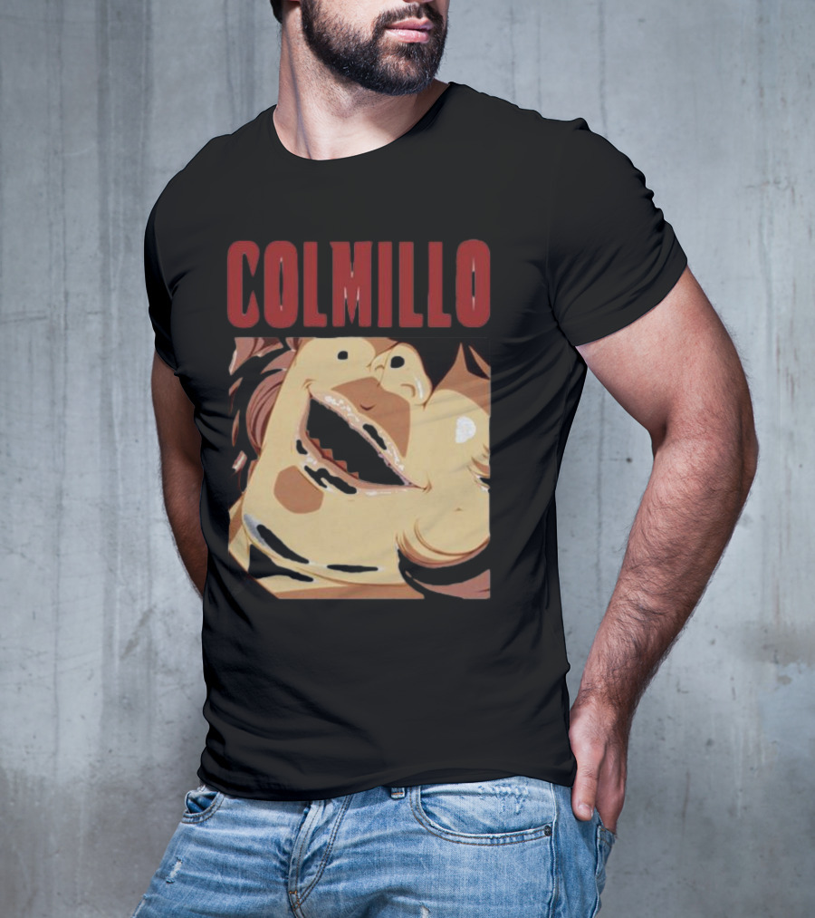 Colmillo Cartoon Face Expression T-shirt — on-model front view, hands behind back.