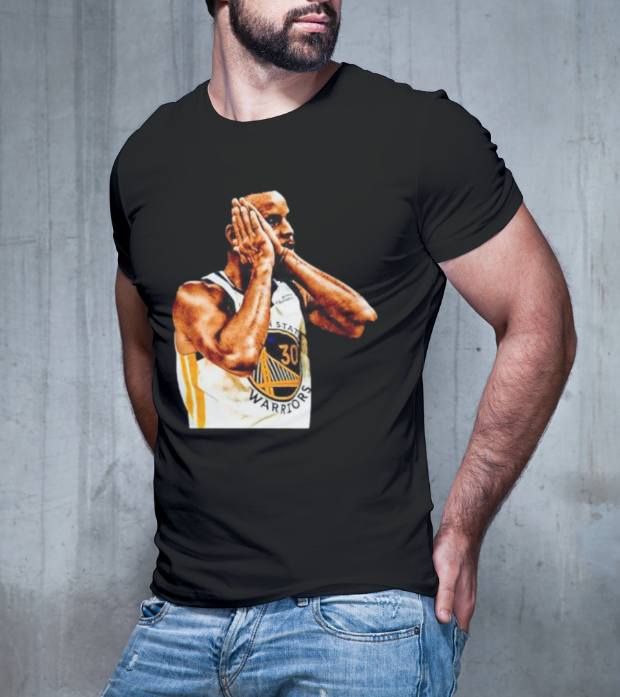 Golden State Warriors Stephen Curry Celebration Fan Tee — on-model relaxed pose, hand behind head.