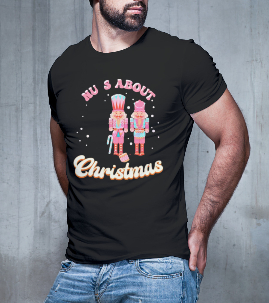 Nutcracker Nu s About Christmas with Candy Cane and Drum T-shirt — on-model front view, hands near pockets.