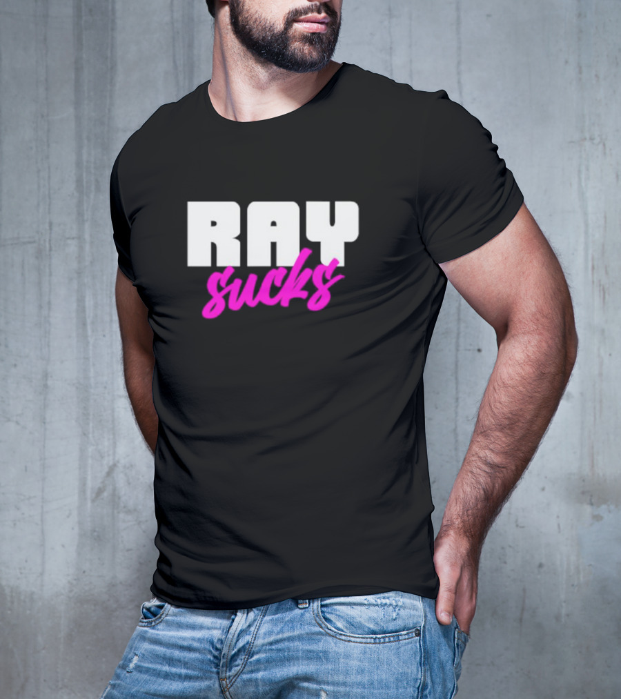 RAY SUCKS Bold Pink Tee — on-model relaxed pose, hand behind head.