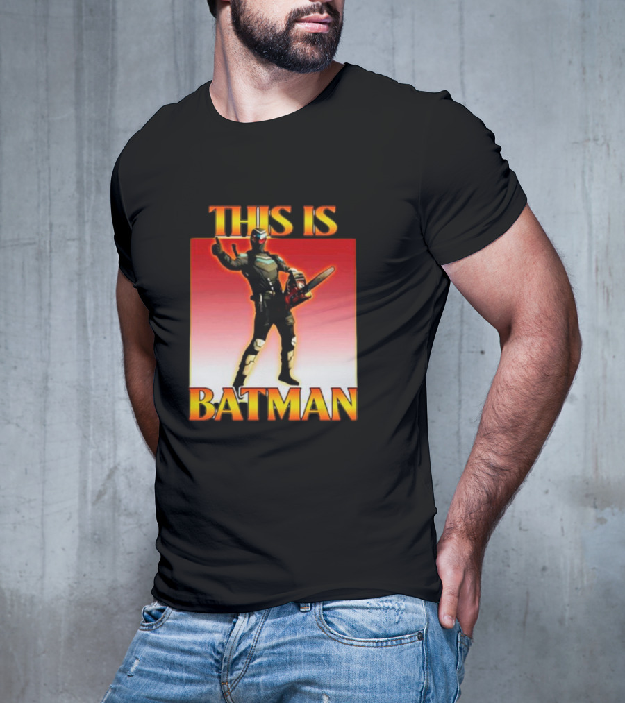 THIS IS BATMAN Chainsaw Hero T-shirt — on-model front view, hands behind back.