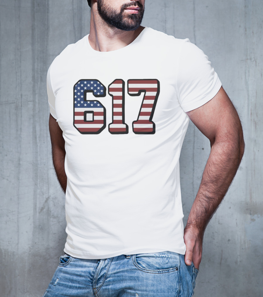 Boston 617 USA Flag T-shirt — on-model front view, hands behind back.