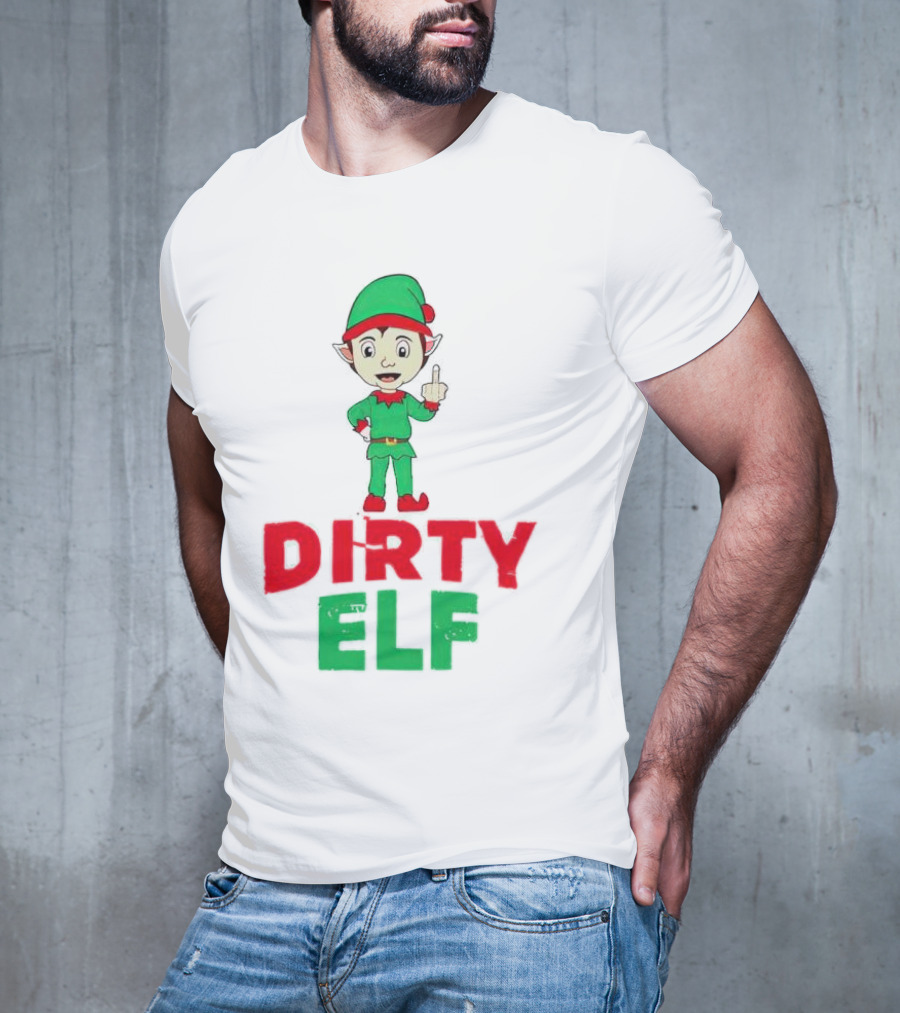 Dirty ELF Christmas Middle Finger T-shirt — on-model front view, hands near pockets.