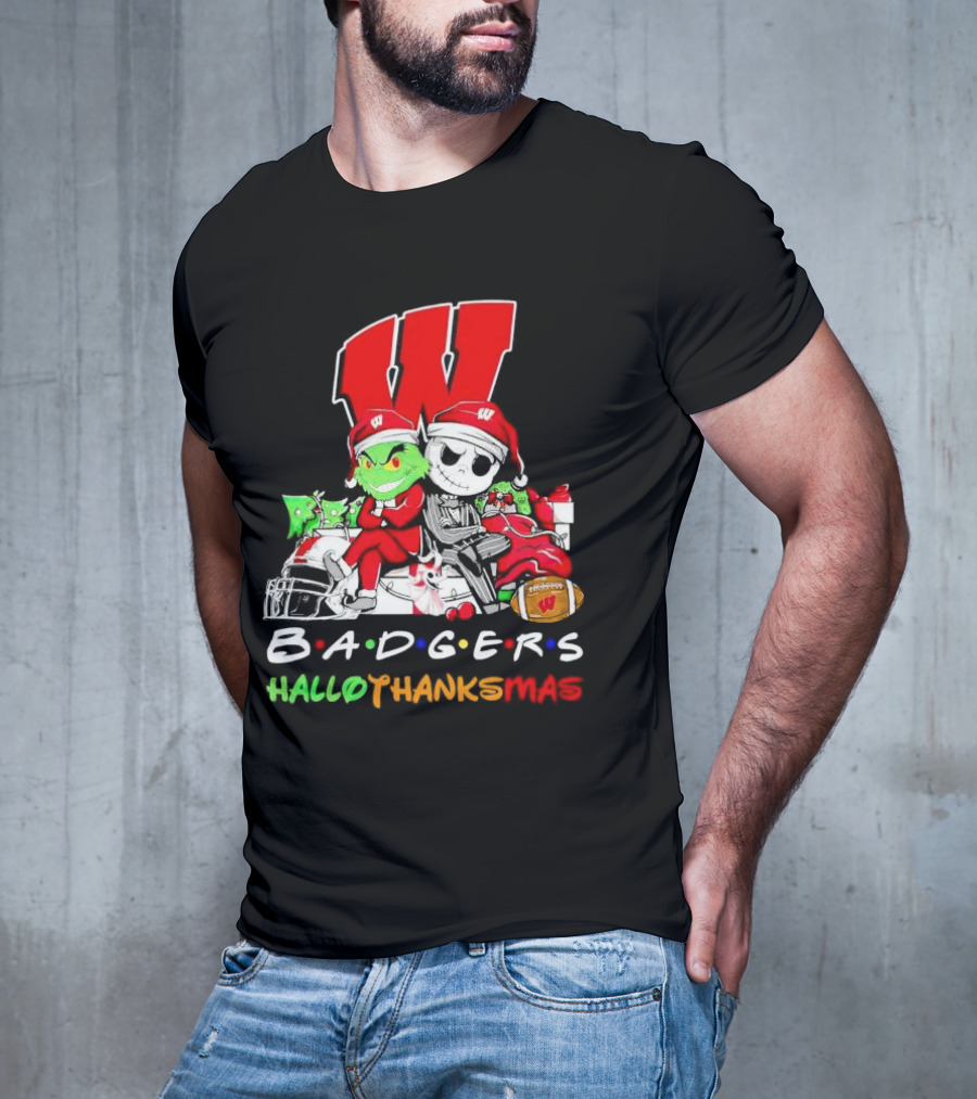 Badgers HalloThanksMas Grinch Jack Skellington Friends Football W T-shirt — on-model front view, hands near pockets.