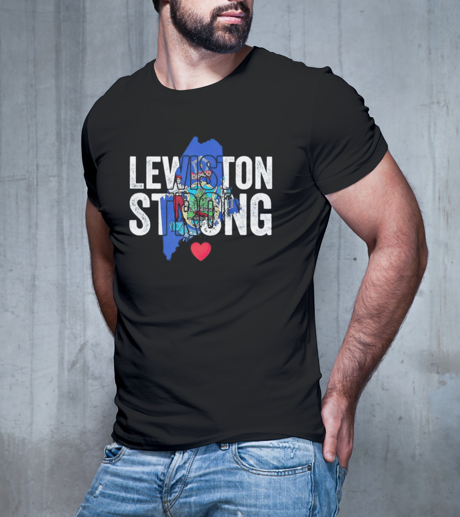 Lewiston Strong Maine Heart T-shirt — on-model front view, hands near pockets.