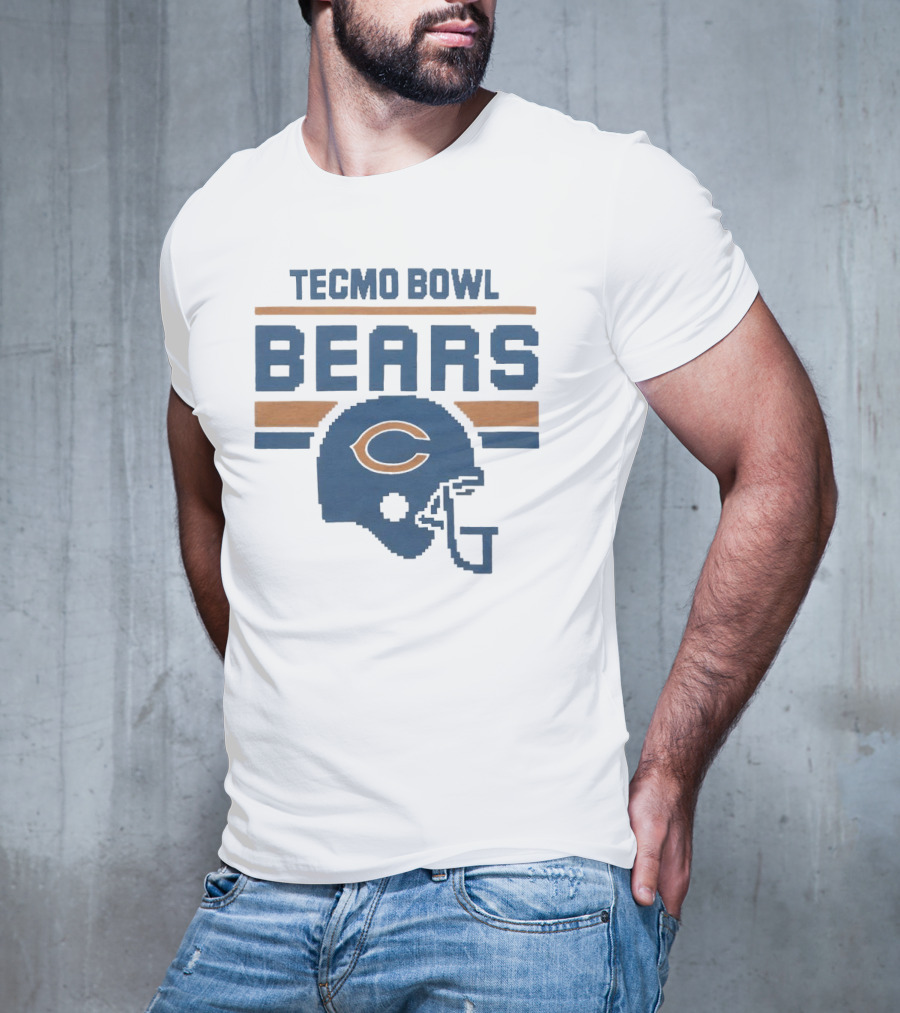 TECMO BOWL CHICAGO BEARS HELMET ICONOGRAPHY RETRO 8-BIT T-shirt — on-model front view, hands behind back.