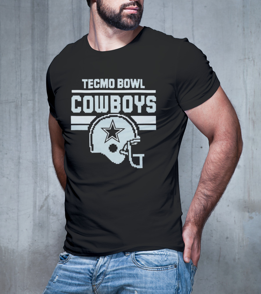 Tecmo Bowl Cowboys Helmet Vintage Pixel T-shirt — on-model front view, hands near pockets.