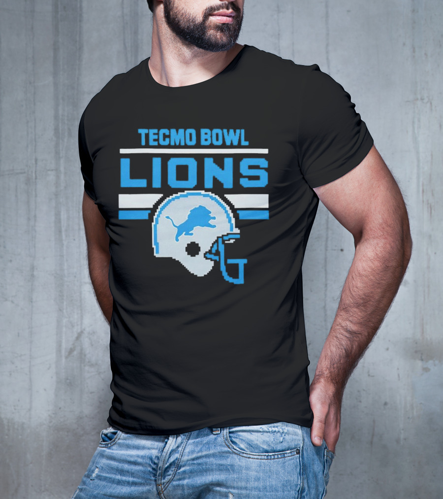 Tecmo Bowl Lions Helmet Detroit T-shirt — on-model front view, hands near pockets.