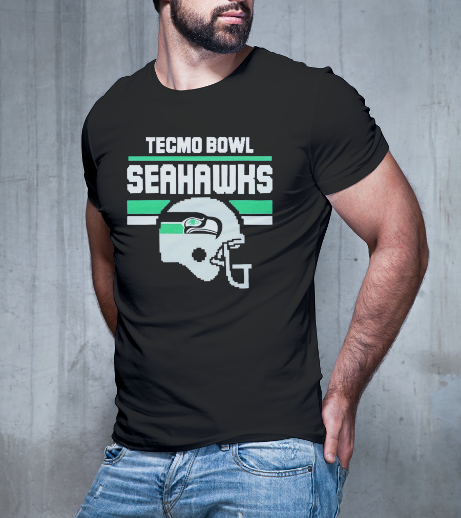 Tecmo Bowl Seattle Seahawks Helmet T-shirt — on-model front view, hands near pockets.