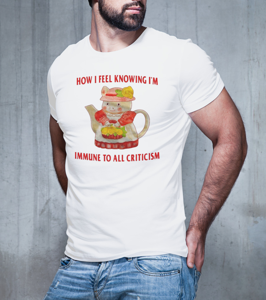 How I Feel Knowing I'm Immune to All Criticism Cute Teapot with Flowers Tee — on-model relaxed pose, hand behind head.