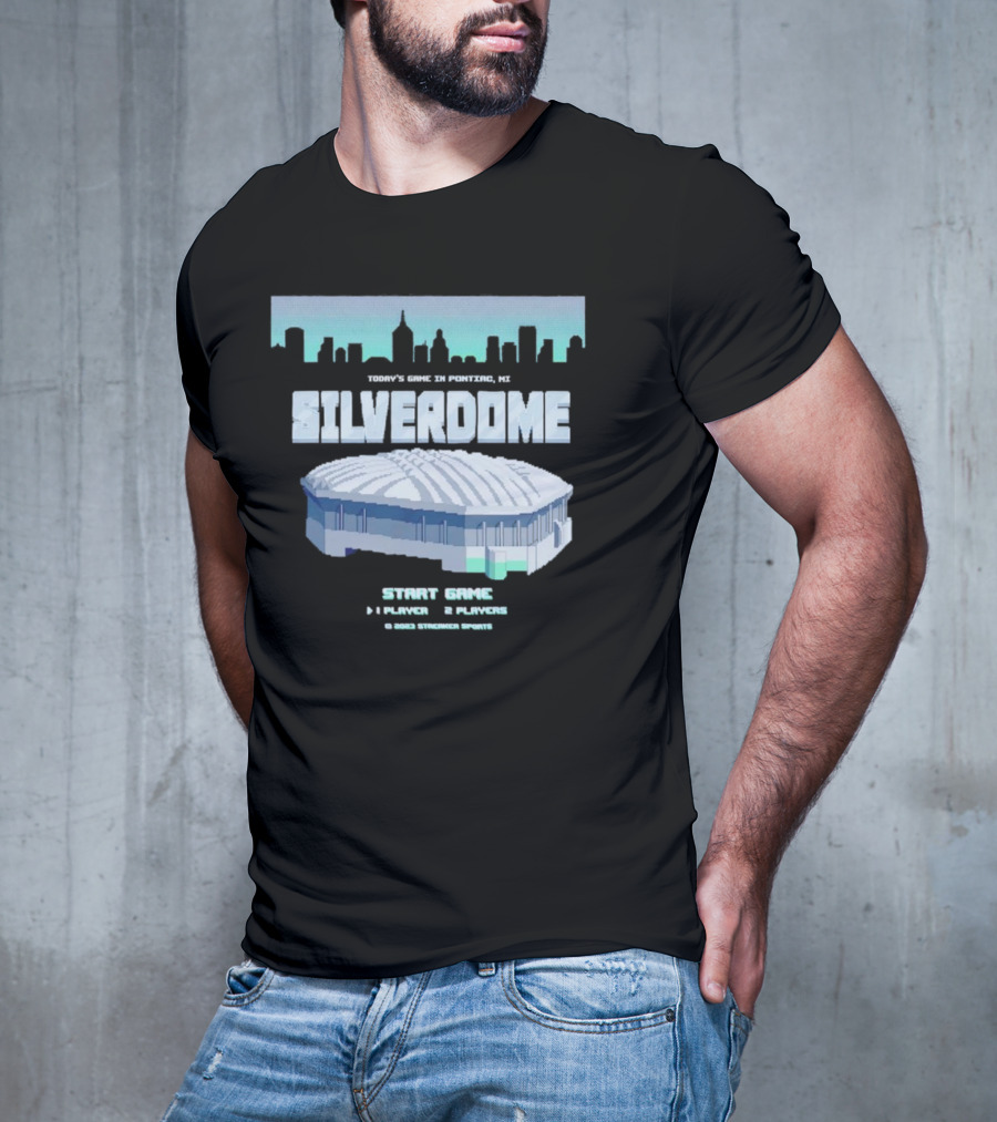 Silverdome 8-Bit Today's Game in Pontiac MI Start Game 1 Player 2 Players Tee — on-model relaxed pose, hand behind head.