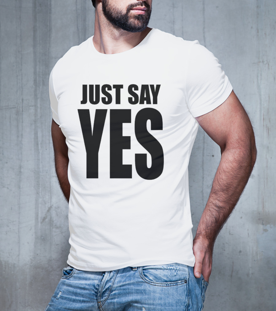 JUST SAY YES T-shirt — on-model front view, hands near pockets.