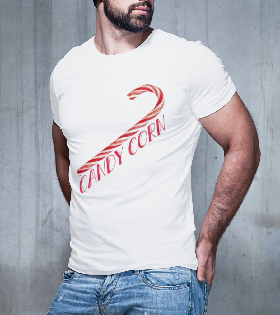 Candy Corn Candy Cane Mischief T-shirt — on-model front view, hands near pockets.