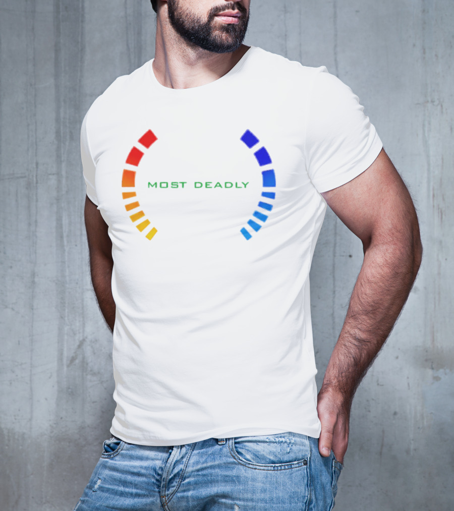 Most Deadly Halo Energy Sword Indicator Tee — on-model relaxed pose, hand behind head.