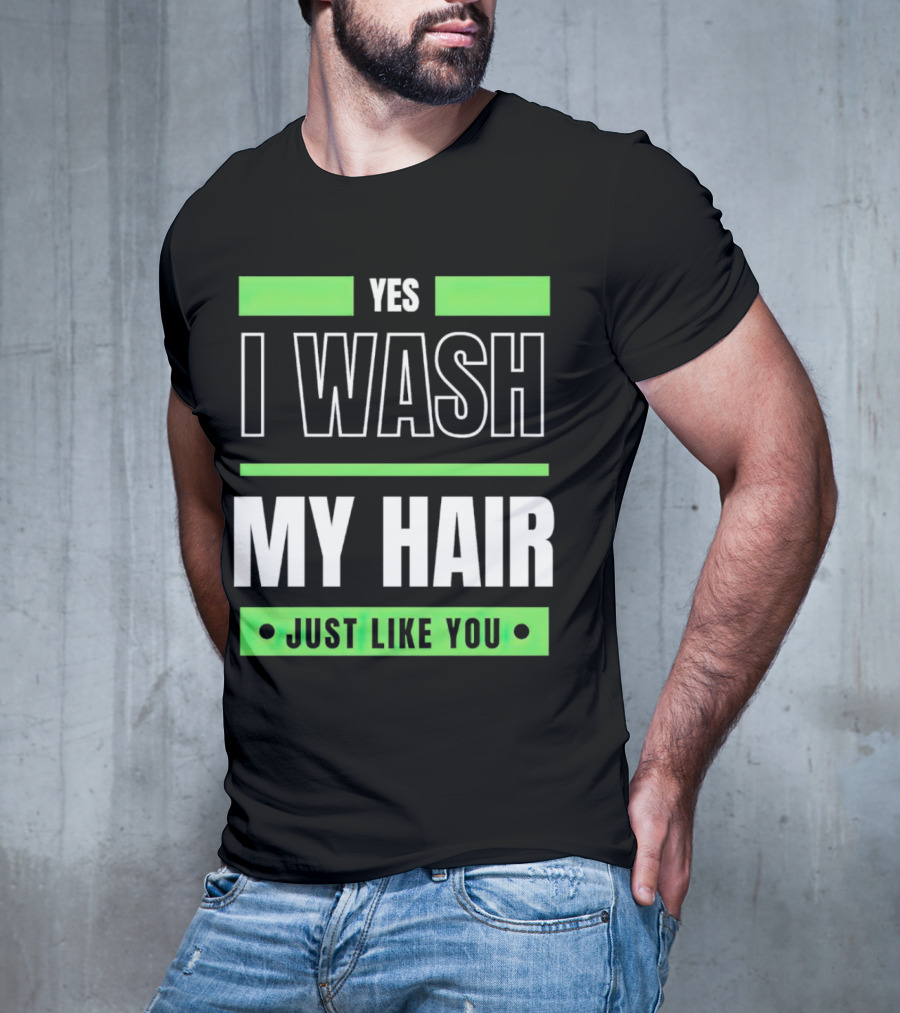 Yes I Wash My Hair Just Like You T-shirt — on-model front view, hands near pockets.