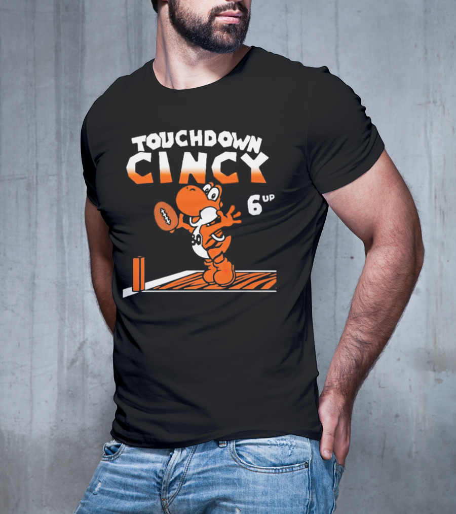 Touchdown Cincy Football Celebration Cartoon 6 Up T-shirt — on-model front view, hands near pockets.