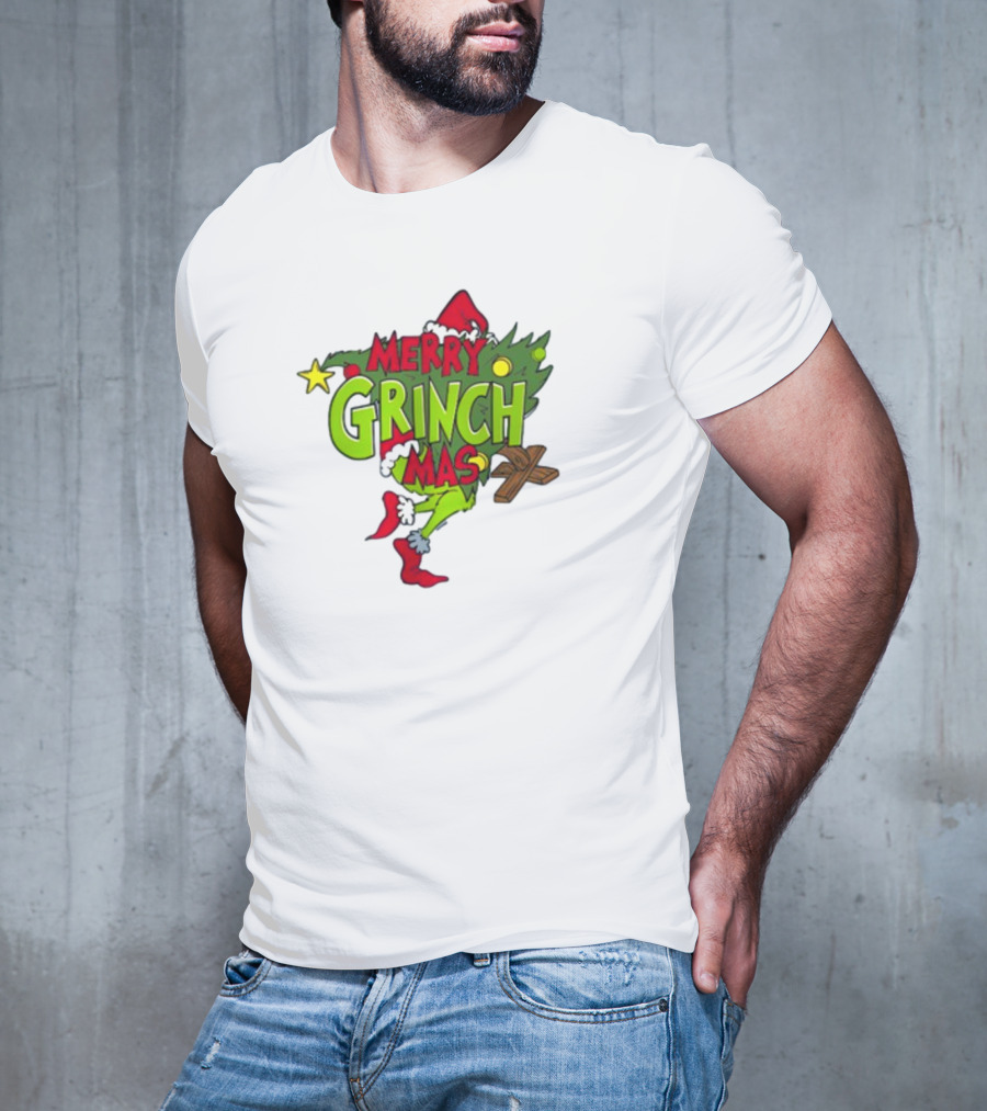 Merry Grinchmas Tree With Santa Hat And Holiday Decorations T-Shirt