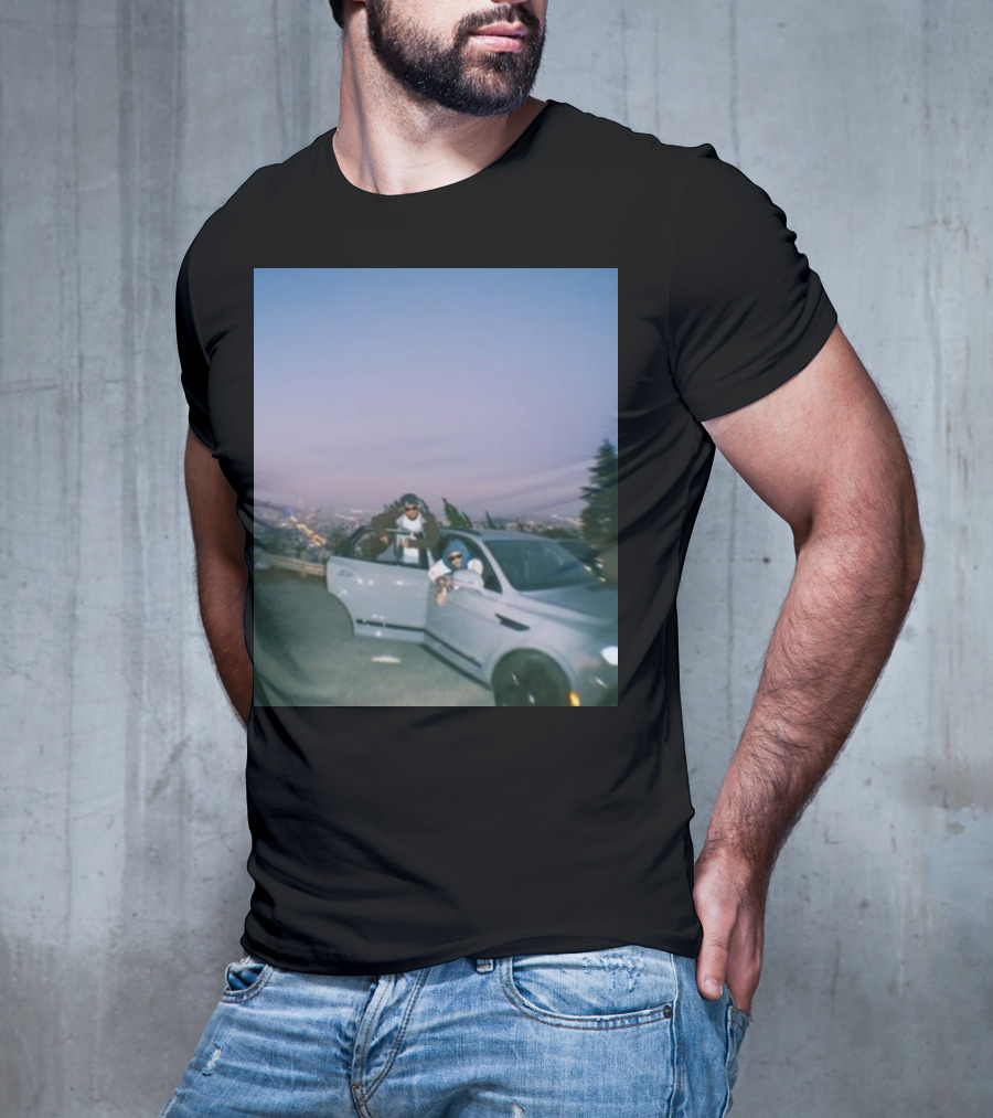 Larry June The Night Shift Scenic Car Moment Tee — on-model relaxed pose, hand behind head.