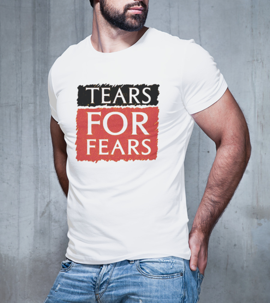 TEARS FOR FEARS Iconic Logo on Black T-shirt — on-model front view, hands behind back.