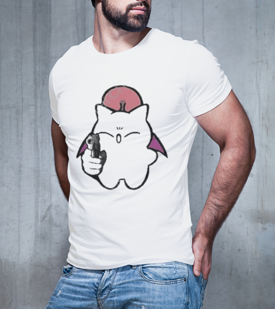 Gun Wielding Moogle by Wisdomeel Tee — on-model relaxed pose, hand behind head.
