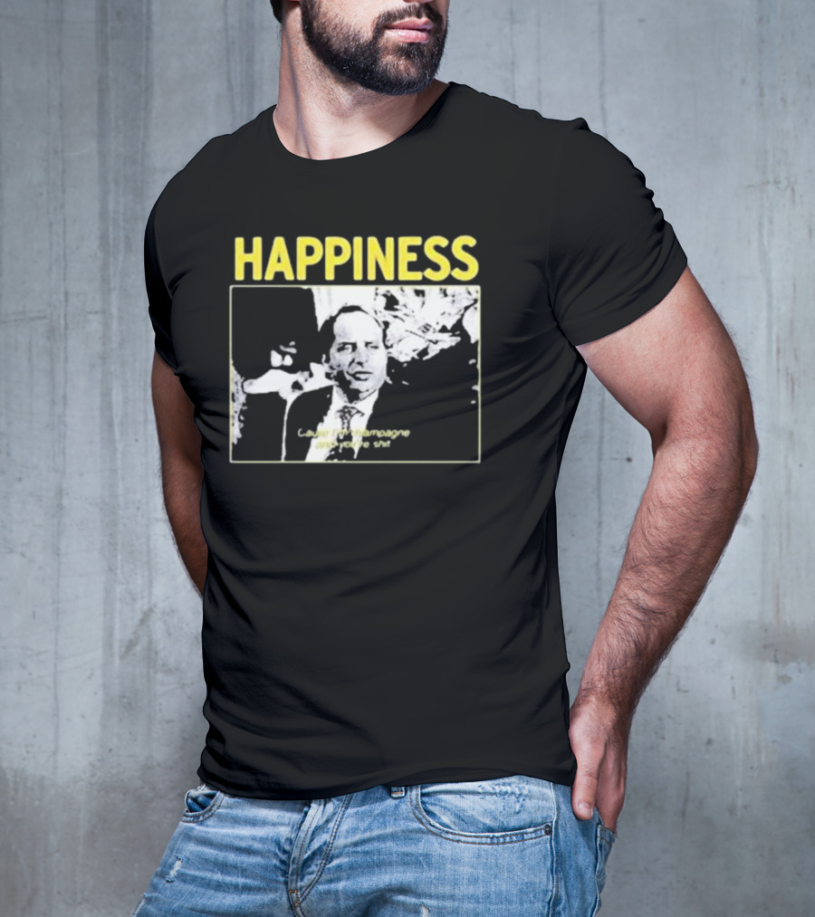 Happiness Laugh at Champagne T-shirt — on-model front view, hands near pockets.