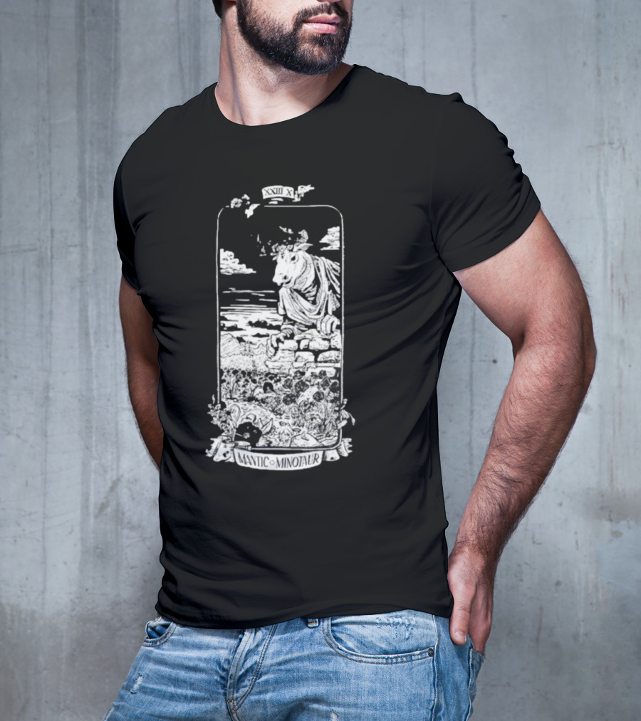 Mantic Minotaur XXIII XI Mythical Beast T-shirt — on-model front view, hands behind back.