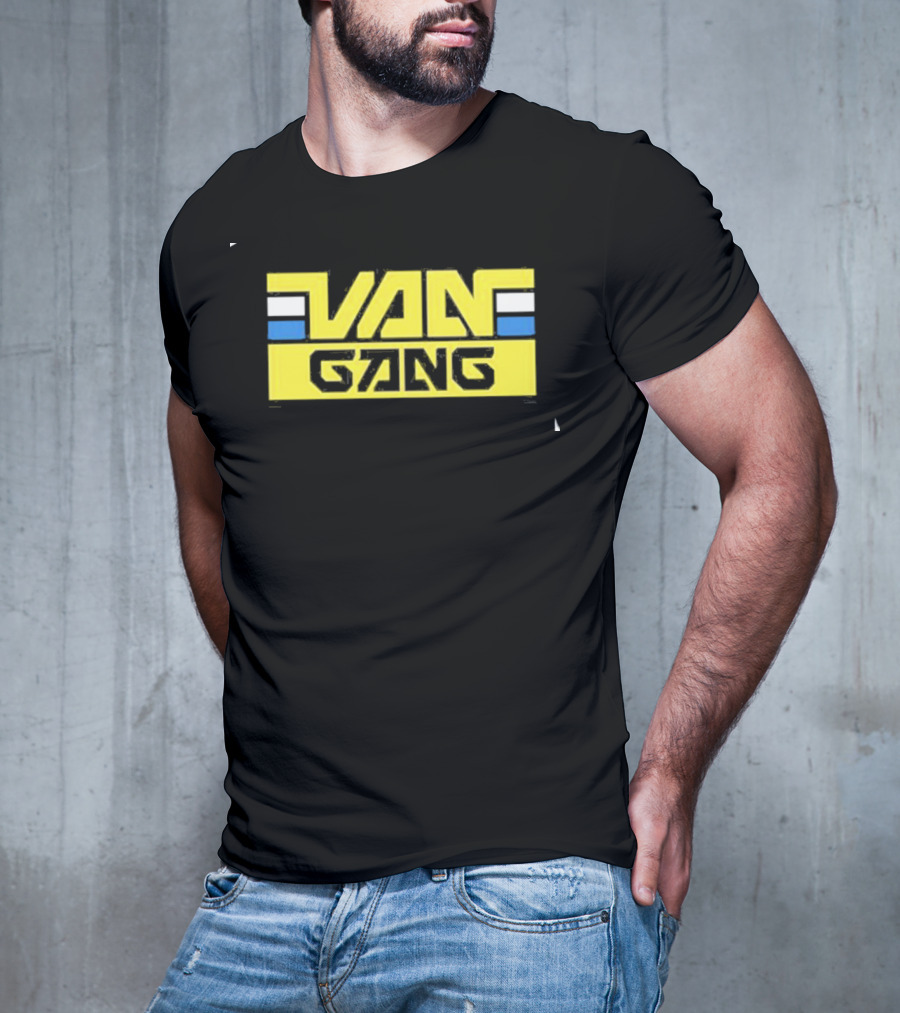 Streamlabs Van Gang Retro Block T-shirt — on-model front view, hands behind back.