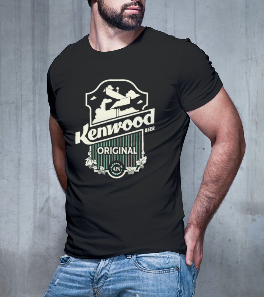 Kenwood Beer Original Kelly Green Alcohol Volume 4.1% T-shirt — on-model front view, hands behind back.