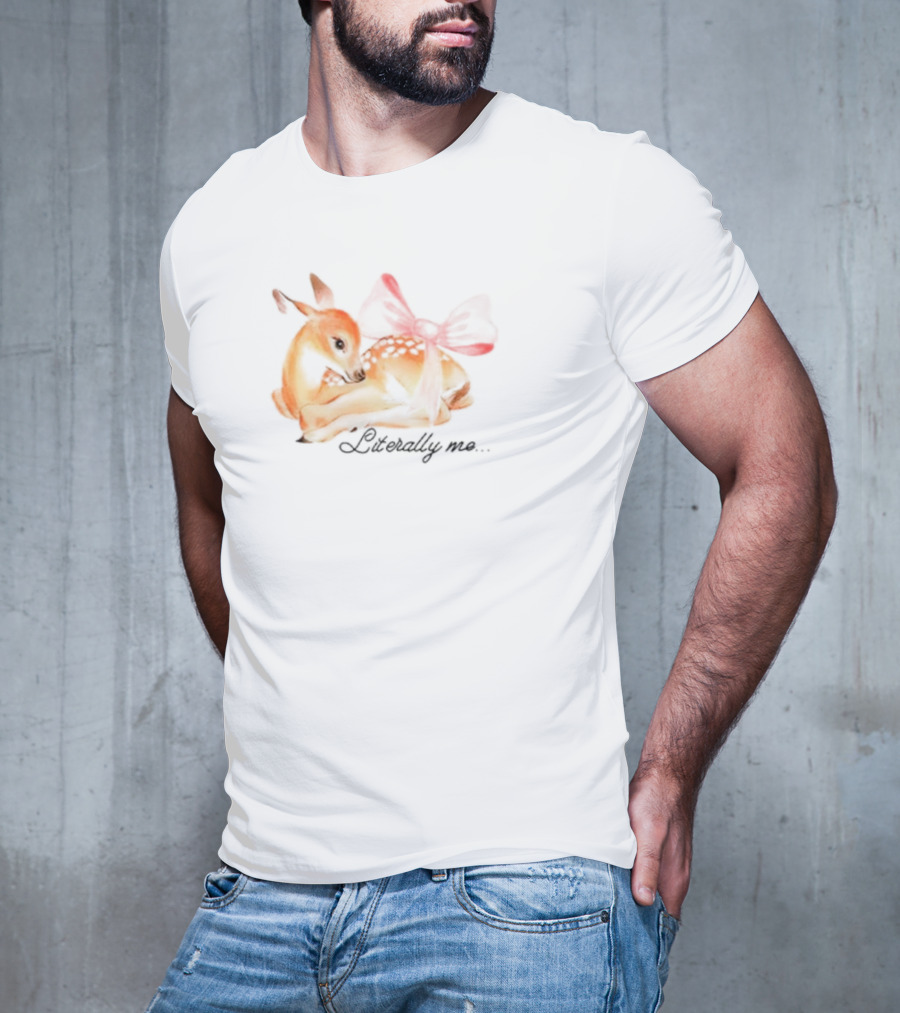 Coquette Fawn with Red Bow Literally Me T-shirt — on-model front view, hands behind back.