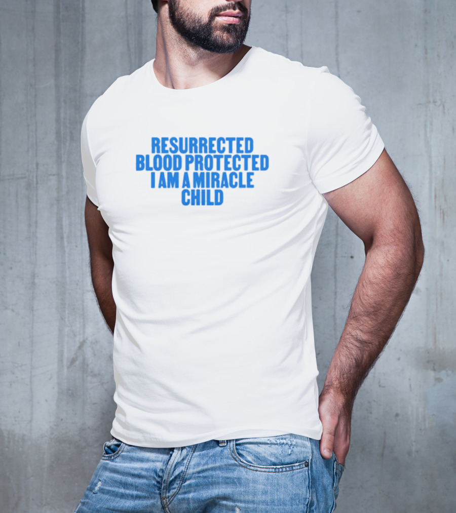 Resurrected Blood Protected Miracle Child Declaration Tee — on-model relaxed pose, hand behind head.