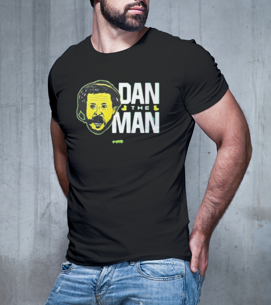Dan The Man Coach Face With Headset Tee — on-model relaxed pose, hand behind head.