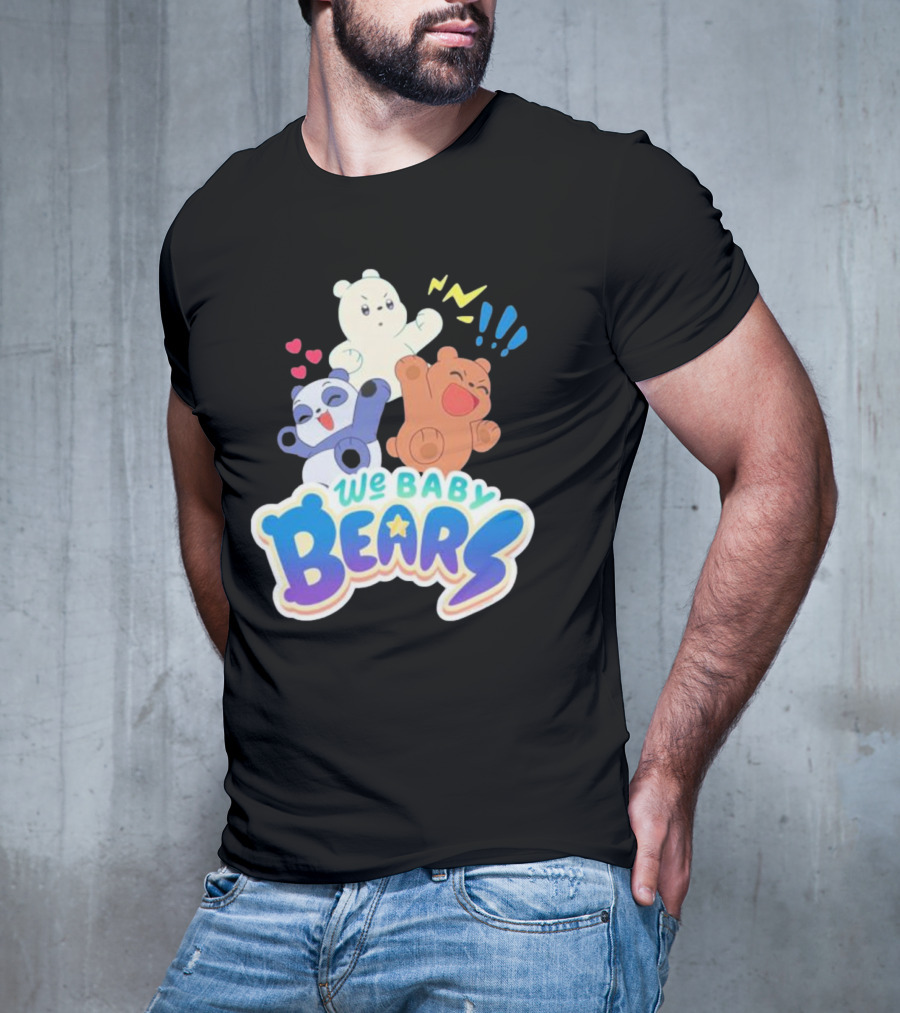 We Baby Bears Trio with Happy Expressions Tee — on-model relaxed pose, hand behind head.