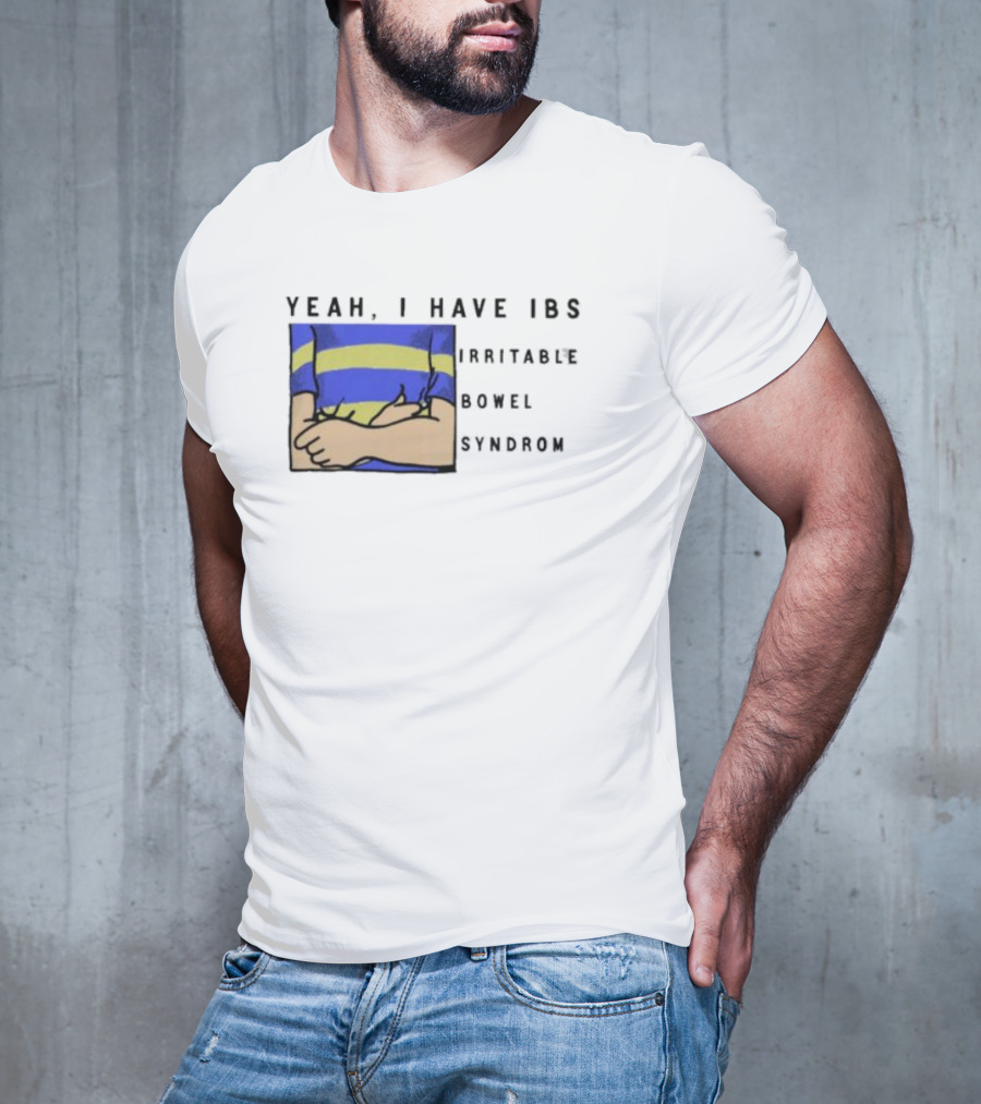 Yeah I Have IBS Irritable Bowel Syndrome Blue and Yellow Striped Shirt Holding Stomach Tee — on-model relaxed pose, hand behind head.