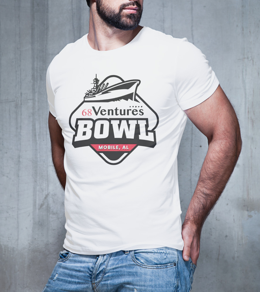 68 Ventures Bowl Mobile AL T-shirt — on-model front view, hands behind back.