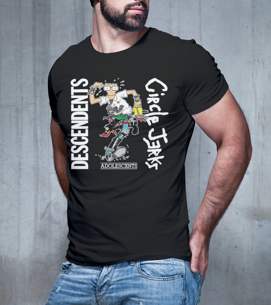 Descendents Circle Jerks Adolescents Tour T-shirt — on-model front view, hands near pockets.
