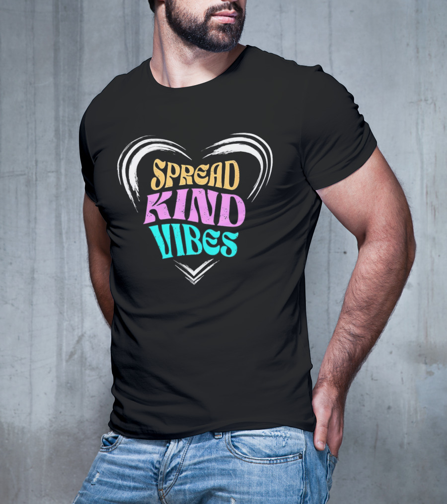 Spread Kind Vibes Colorful Heart T-shirt — on-model front view, hands near pockets.