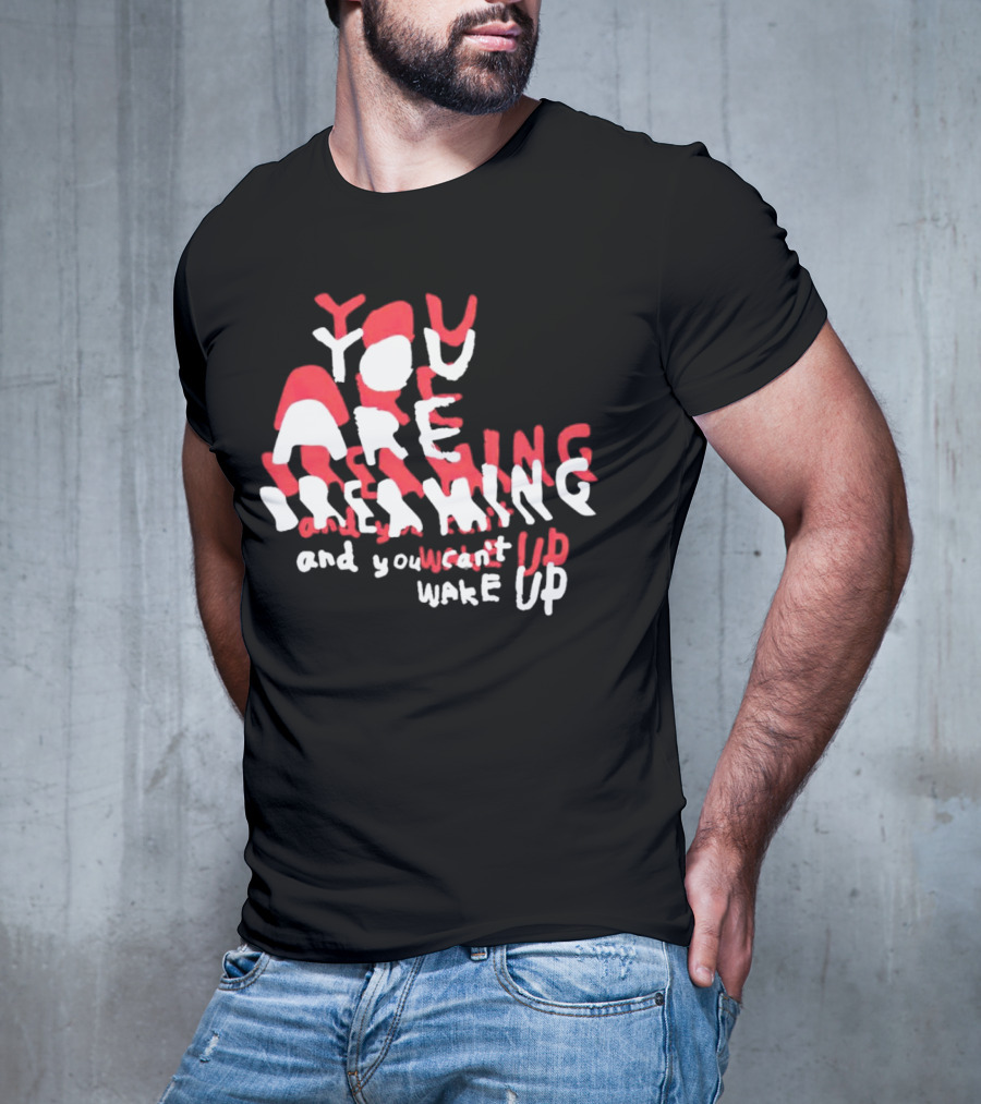 You Are Dreaming and You Can’t Wake Up T-shirt — on-model front view, hands near pockets.