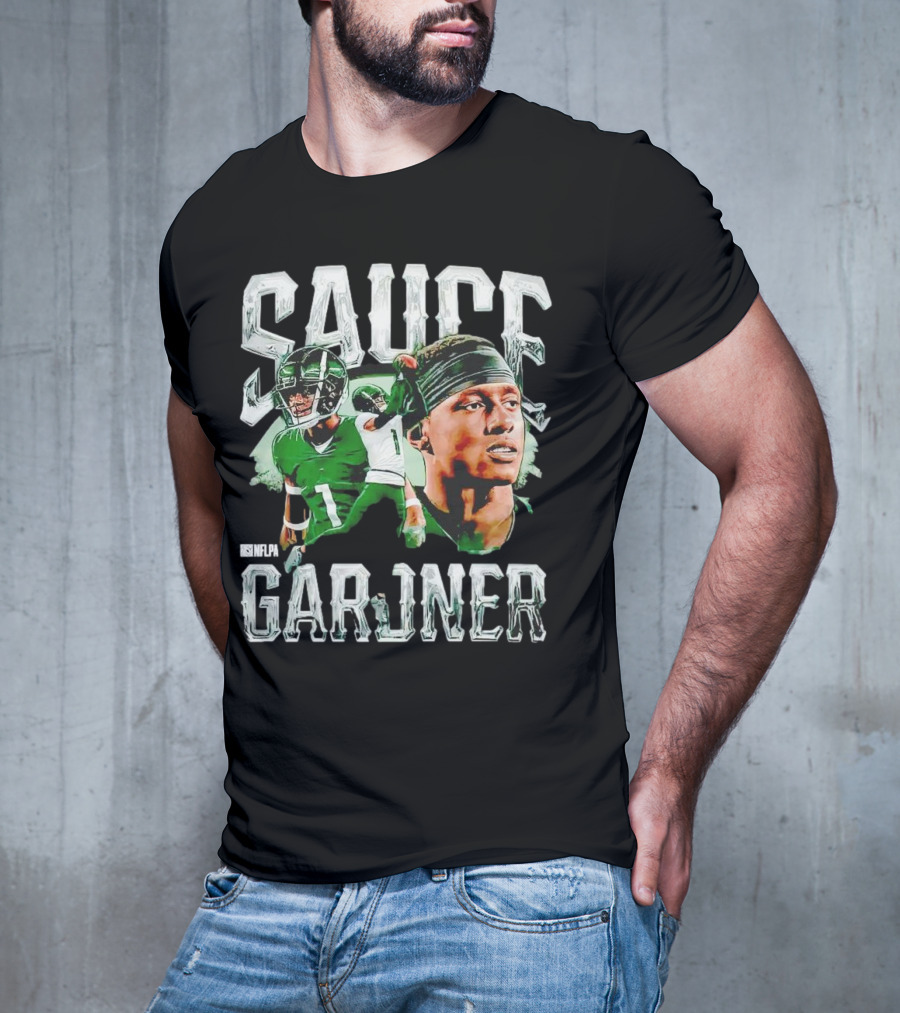 Sauce Gardner NFLPA New York Jets T-shirt — on-model front view, hands behind back.