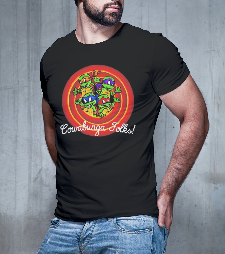 Teenage Mutant Ninja Turtles Cowabunga Folks Raphael Michelangelo Donatello Leonardo T-shirt — on-model front view, hands near pockets.
