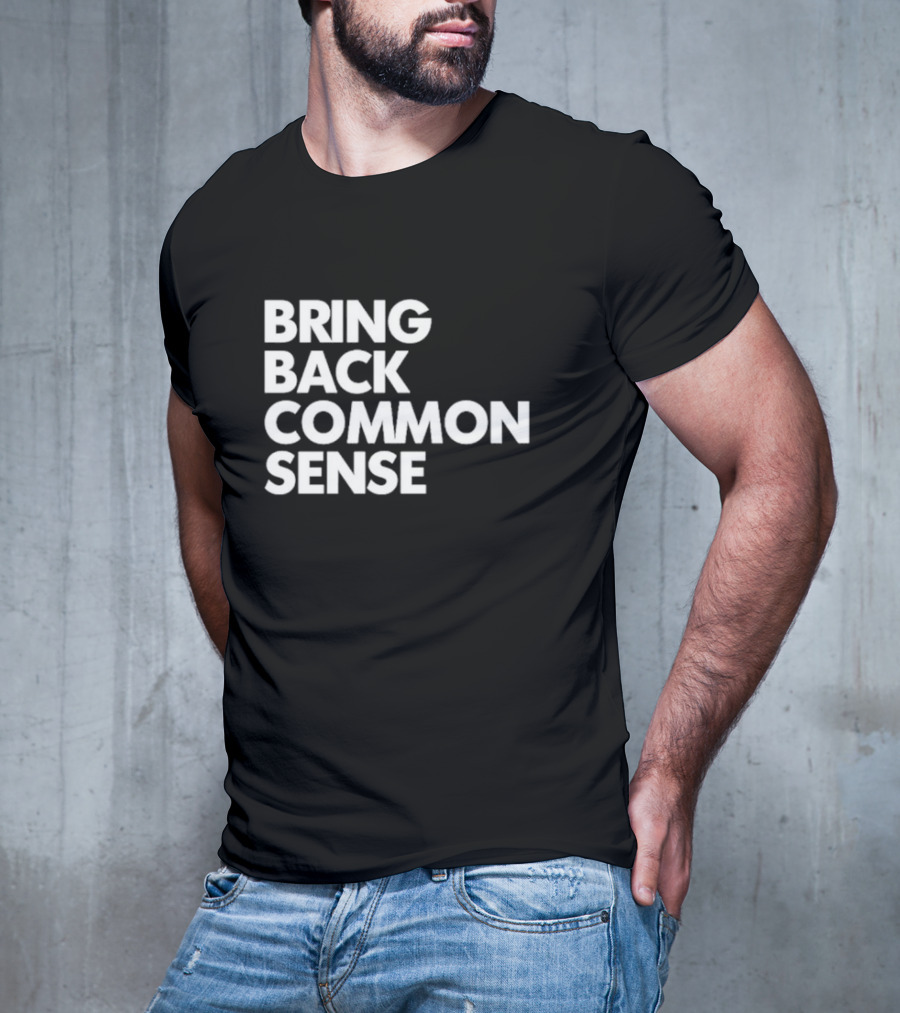 Bring Back Common Sense T-shirt — on-model front view, hands behind back.