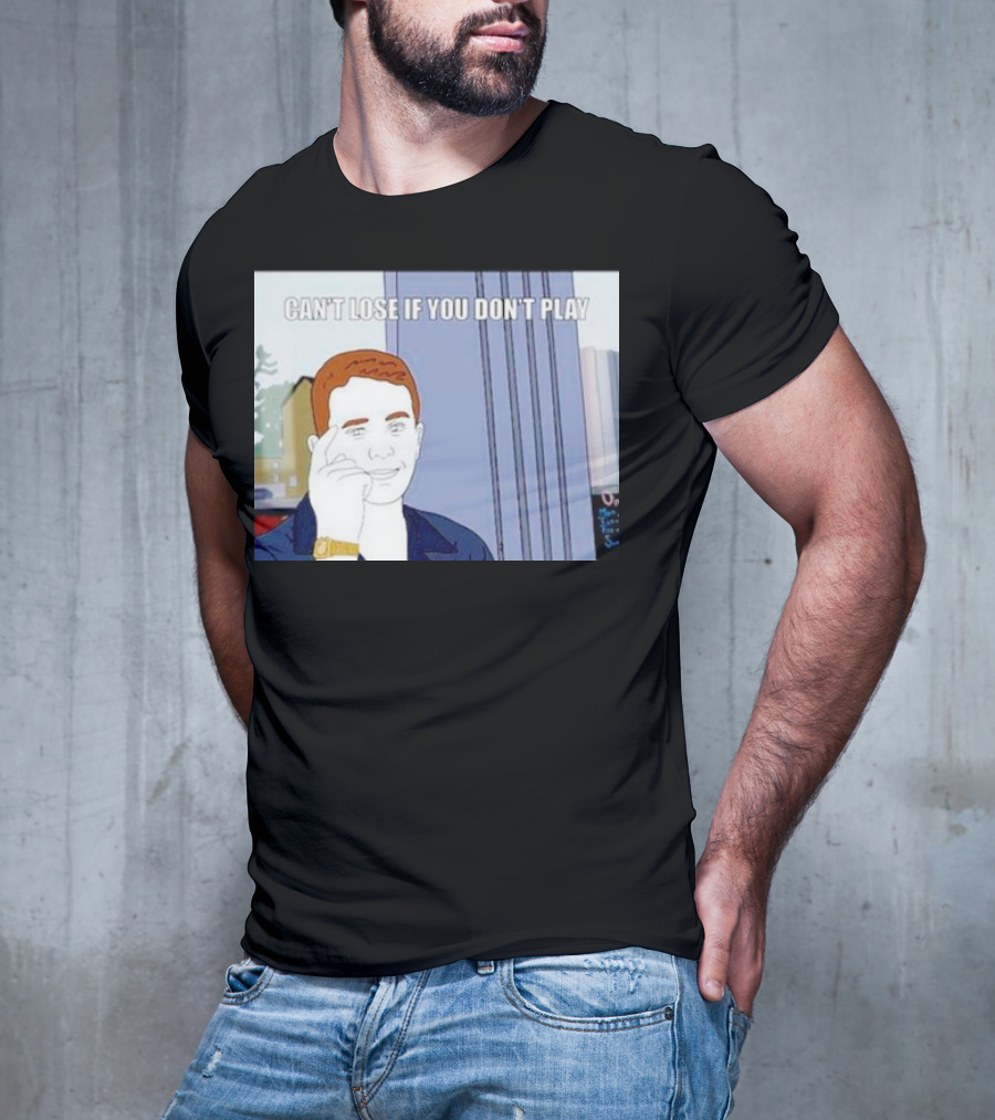 Can't Lose If You Don't Play Smart Thinking Meme Tee — on-model relaxed pose, hand behind head.