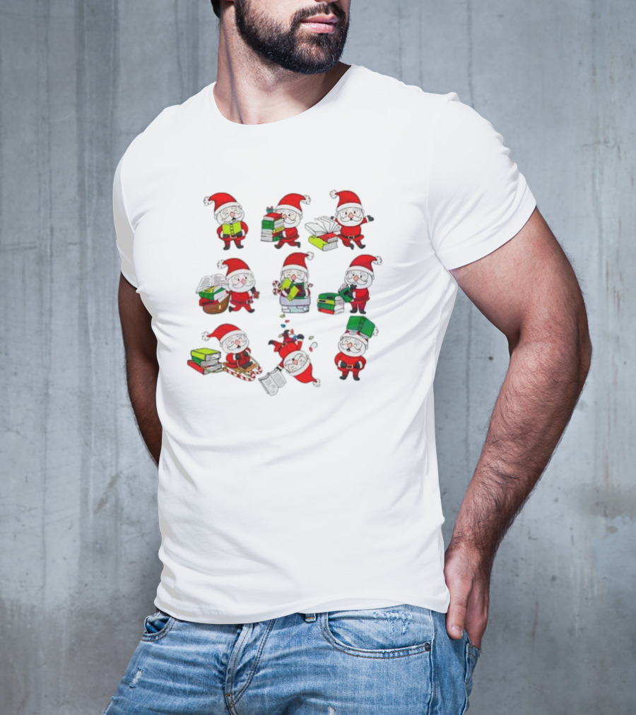 Funny Santa Claus Reading Books And Carrying Stacks In Various Poses T-Shirt