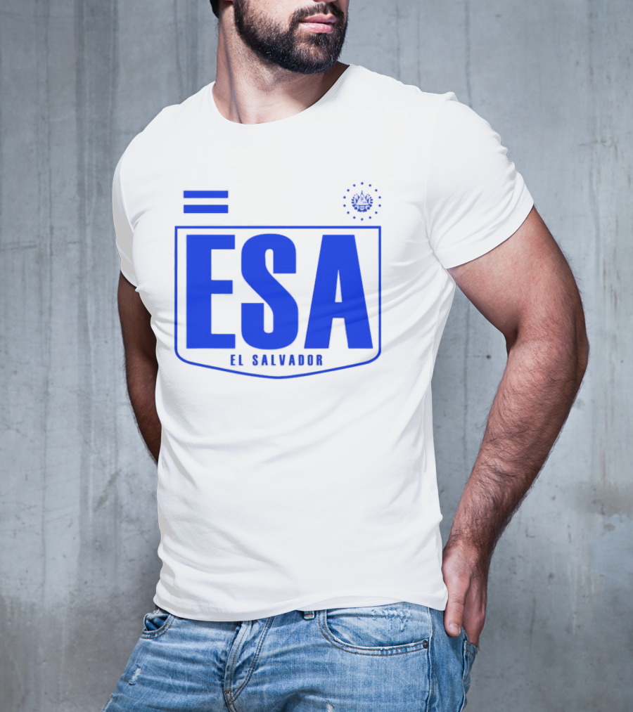 ESA El Salvador Logo Emblem with National T-shirt — on-model front view, hands near pockets.